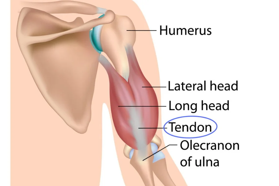 Tendons are a form of connective tissue that connects muscle to bone and allows for movement. The triceps muscle starts at the shoulder and runs down the back of the arm until it reaches the elbow. The triceps tendon connects the triceps muscle to the olecranon process at the elbow (a bony bump at the base of the elbow). When the triceps tendon becomes inflamed, it is known as triceps tendonitis.